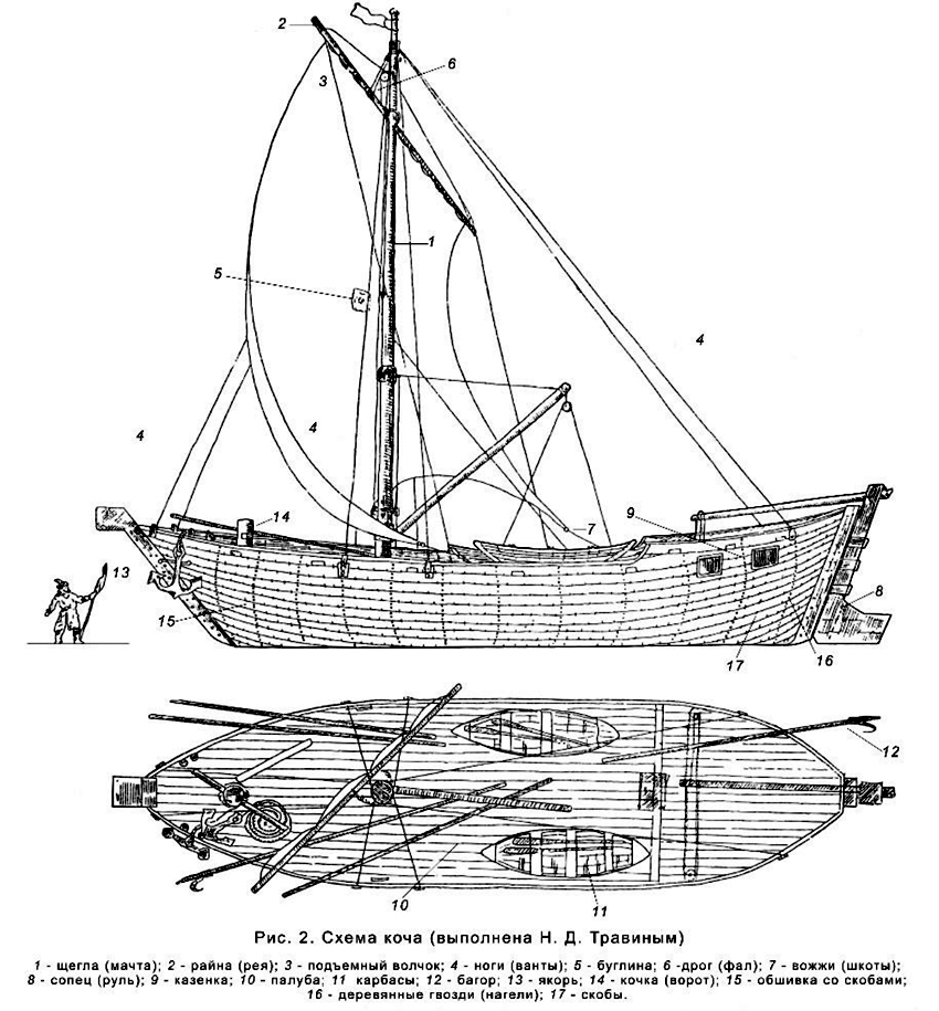 «Большой морской коч имел до 19 метров в длину, 5 метров в ширину, до 2‒2,5 метров осадки, 90 тонн водоизмещения и 40 тонн грузоподъемности, — пишет Михаил Белов. — На верхней палубе размещались две лодки, чаще всего карбаса, на нижней — три-пять железных якоря, весом от 5 до 10 пудов каждый, и в трюмах — грузы. Коч ходил под двумя парусами».