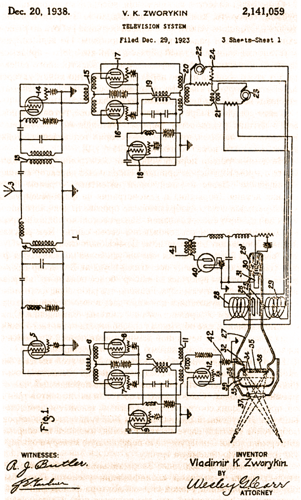 Новаторскую заявку на изобретение системы электронного ТВ ожидала трудная судьба. Патент на изобретение первой системы электронного ТВ ему выдали лишь спустя пятнадцать лет после подачи заявки — 20 декабря 1938 года, когда многие жители Нью-Йорка уже имели дома телевизионные приемники с кинескопом Зворыкина.