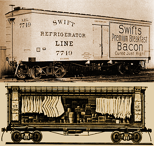 Сам по себе ответ на вопрос, как перевезти мясо, чтобы оно не испортилось, был очевиден: туши следовало везти охлажденными. Было понятно, и где взять источник такого охлаждения. Уже с первой половины XIX века в США существовала развитая отрасль заготовки льда — он добывался зимой на реках и озерах северо-востока США и затем доставлялся потребителям на юг и даже перевозился на кораблях в Британскую Индию. Это был эффективный и доходный бизнес. Стоит сказать, что в последние десятилетия функционирования колонии Русская Америка на Аляске, когда популяция каланов, чей мех был одним из основных источником дохода колонистов, резко сократилась, убытки пробовали частично возместить поставками льда в быстро растущую Калифорнию. Однако успешно начатое предприятие вскоре расстроилось, когда альтернативные поставщики наладили более дешевую доставку льда с гор Сьерра-Невада.