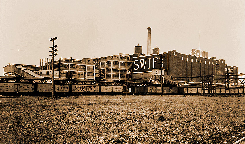 Одним из важнейших транспортных узлов, где пересекались многие линии, ведущие с запада в сторону городов Восточного побережья, стал город Чикаго, что определило превращение города в гигантский центр бизнеса, связанного с мясом. Однако первоначально главной функцией Чикаго был сбор и распределение живого скота, закупленного и доставленного из западных прерий и из других центров разведения. В 1864 году несколько железнодорожных компаний объединились для создания на болотистой территории к югу от города гигантских инфраструктурных сооружений для содержания прибывающего скота, получивших название Union Stockyards. На территории в полтора квадратных километра было построено больше 2000 загонов, где одновременно могли содержаться 21 тысяча коров, 75 тысяч свиней и 21 тысяча овец. В 1875 году Густавус Свифт решает переместиться в Чикаго.