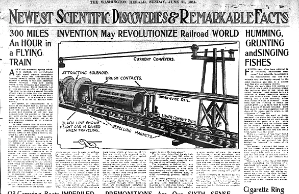 Спустя год свою модель поезда на магнитной подушке, так называемого летающего поезда, разработал француз Эмиль Башеле. В 1914 году он приехал в Лондон, где и продемонстрировал свой проект мировой общественности, вызвав колоссальный интерес. «Летающий поезд» Башеле имел электродинамическую подвеску, работая за счет «электродинамического отталкивания» — по всему пути под дорогой устанавливались электромагниты переменного тока, под воздействием которых вагон, имеющий алюминиевое дно, поднимался на нужную высоту, не соприкасаясь при этом с дорогой. Чтобы обеспечить движение, француз предлагал использовать тянущий пропеллер или же соленоиды в виде колец, которые расставлялись вдоль всего пути. Таким образом он рассчитывал достигнуть скорости 500 км/ч. «В нашем понимании электричества мы еще маленькие дети, но мы движемся уверенными темпами. Наступает время летающих железных дорог. Пассажиры пока не смогут летать через пространство. Но перевозка товаров на скорости 300 миль в час — десять часов от Нью-Йорка до Лондона — скоро станет прорывом в торговле и промышленности всего мира», — в июне 1914-го рассказывал журналистам Башеле.