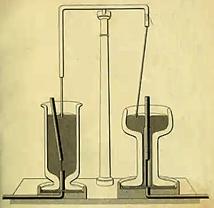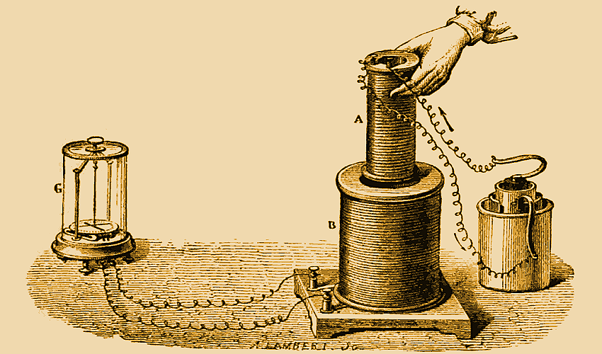 #image-kit_2126Больше всего Фарадея заинтересовали описания опытов датчанина Ганса Эрстеда, показавшего, что стрелка компаса отклоняется, если рядом с ней помещен проводник с протекающим по нему током. Размышляя над этим, Фарадей сконструировал первый в истории простенький электродвигатель: намагниченный стержень, помещенный в колбу с ртутью, вращался вокруг проводника, по которому пропускался ток, — электричество делало механическую работу! Далее Фарадей задумался о следующем: если в опыте Эрстеда электрический ток производит магнитное действие, то не должна ли природа продемонстрировать симметрию и нельзя ли придумать эксперимент, в котором уже магнит вызывает электрический ток? Эта теоретически ничем не подкрепленная на тот момент идея симметрии между электрическими и магнитными явлениями настолько овладела Фарадеем, что на какое-то время он практически поселился в лаборатории, в которую верная жена приносила ему поесть.
