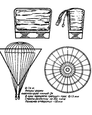 Этот парашют был предназначен для сбрасывания грузов весом до трехсот килограммов. В целях экономии материала и придания большей устойчивости модель была выполнена из перкаля. К сожалению, применения данный тип парашюта не получил.