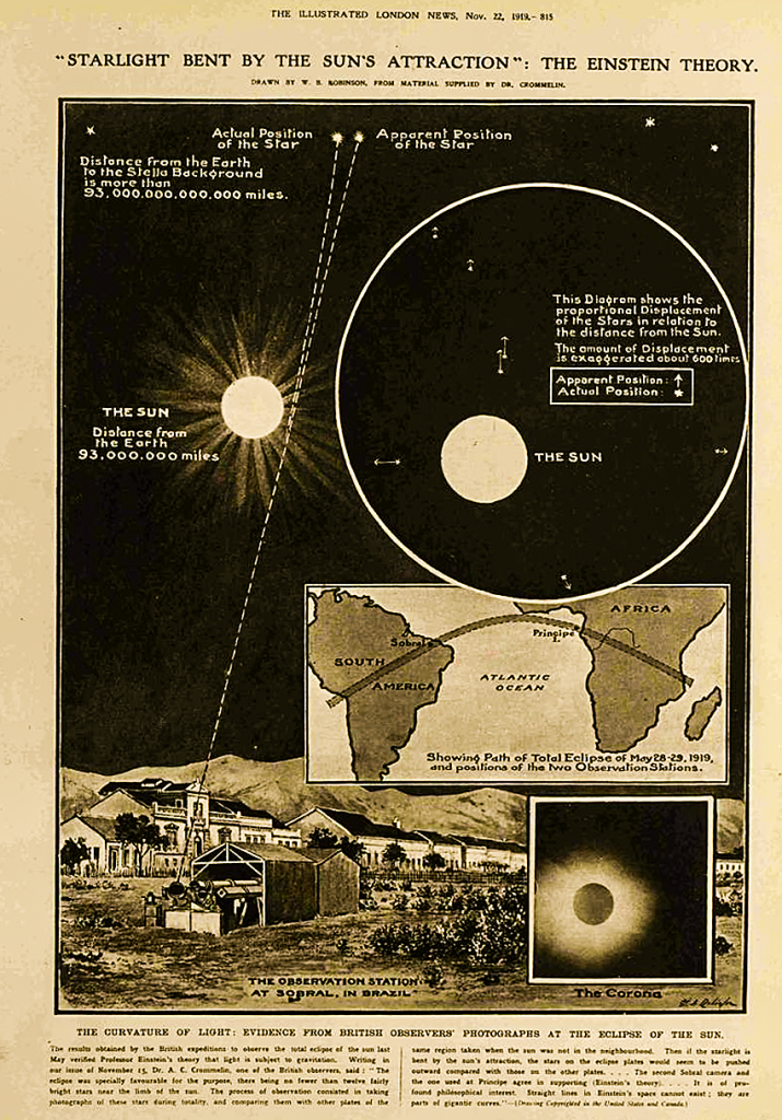 Затмение 1919 года предоставляло особенно удобную возможность для проверки предсказаний Эйнштейна, так как Солнце располагалось на фоне яркого звездного скопления Гиады. Эддингтон успел сделать 16 фотографий, в основном не слишком удачных из-за то начинавшегося, то прекращавшегося дождя. Однако с помощью специальных расчетов удалось показать, что отклонение положения звезд достаточно близко к тому, что предсказывала общая теория относительности, и далеко от предполагаемого классической механикой.