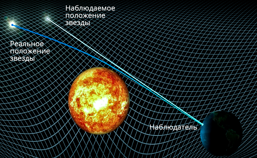 Но этого не хватало, чтобы скептики поверили в ОТО. Требовалось более весомое и наглядное подтверждение новой теории. Таковым могла стать экспериментальная проверка отклонения световых лучей, проходящих вблизи Солнца, также предсказанного Эйнштейном. Например, луч света от далекой звезды, проходящий рядом с Солнцем, должен отклоняться на небольшой угол, и наблюдатель, находящийся на Земле, увидит эту звезду на небе не там, где она обычно находится. В нормальных условиях этот эффект очень труден для наблюдения, так как яркий солнечный свет не позволяет видеть звезды днем. Но такая возможность появляется во время солнечных затмений.