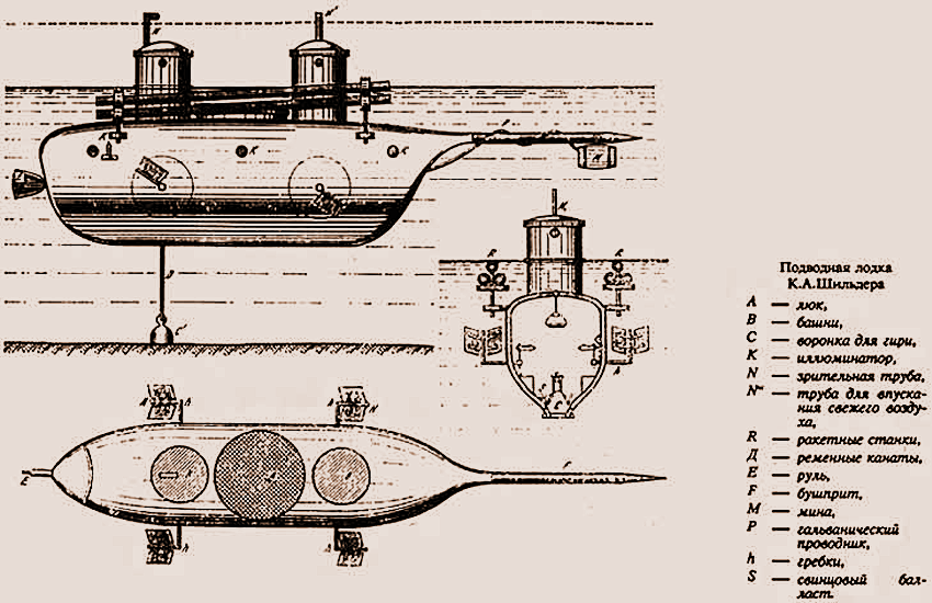 Шильдер занялся строительством подводной лодки, чтобы, как он писал, «найти верное средство к подводу мин под неприятельские корабли, стоящие на якоре, или к уловлению их на ходу… И я немедленно занялся способами к достижению сей цели… и предположил устроить металлическую лодку». Это было первое в России судно с цельнометаллическим корпусом.